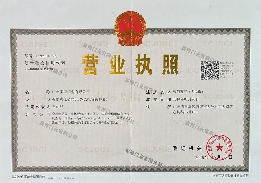 广州实得门业有限公司成立于 2014年, 工厂扩建于广东佛山南海区占地面积 5000 多平米,公司是集设计、开发、销售、服务为一体的企业。致力于同类产品文化的研究,并拥有高素质的专业技术研究人员,技术力量雄厚,科技含量高,产品质量好,赢得了客户的信赖。拥有设计师4人,工艺师6人,专业质检人员2人,生产工人23人,生产设备共36台。致力于纯平铝板门,镜面车库门。铝合金透视门,格栅车库门,高端硬质卷帘门等。